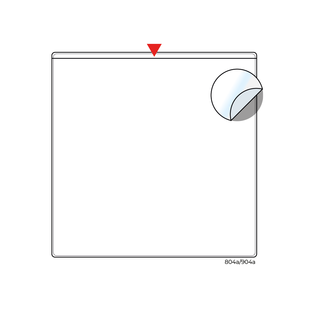 Adhesive vinyl enveloppe. Clear or white adhesive backing. Opening on long side. Multiple purposes in retail stores, signalisation, factories, etc.